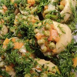 Finely chop the spring onions and dill and divide it over the artichokes.