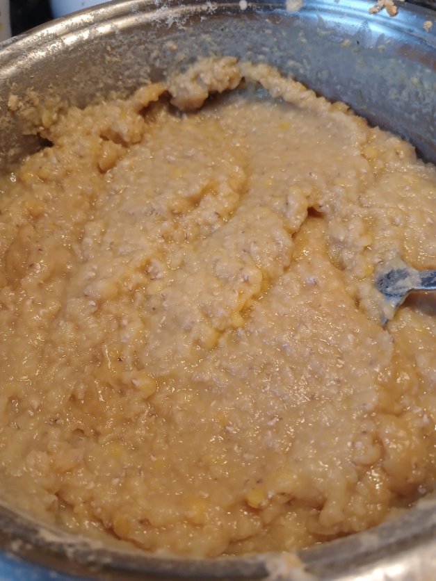 While the lentils are hot, blend them with a hand blender to obtain a smooth consistency. It should have the consistency of a slightly fluid and soft dough.