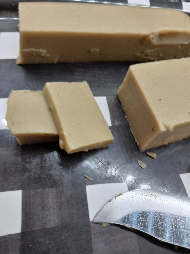 Transfer the solidified lentil mold to a tray by turning it upside down. Slice it into slices about 0.5 cm wide.