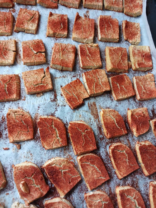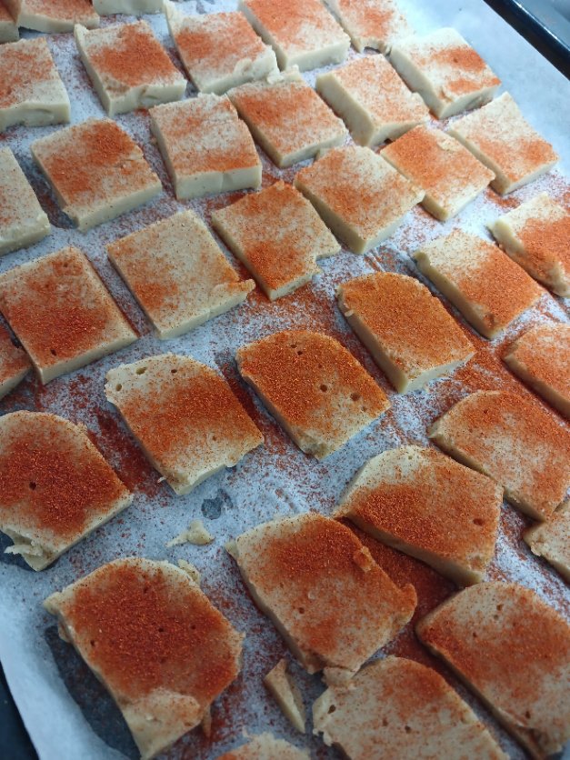 Place the lentil slices on a baking tray lined with baking paper. Pour the red pepper powder over them using a small wire strainer and put them in the oven.