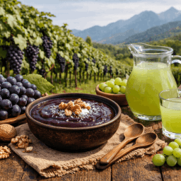 This light dessert from the Black Sea region is made with purple and fragrant isabella (pepeçura) grapes unique to that region. However, it is possible to achieve a similar taste with thin-skinned black grapes. Pepecura…
